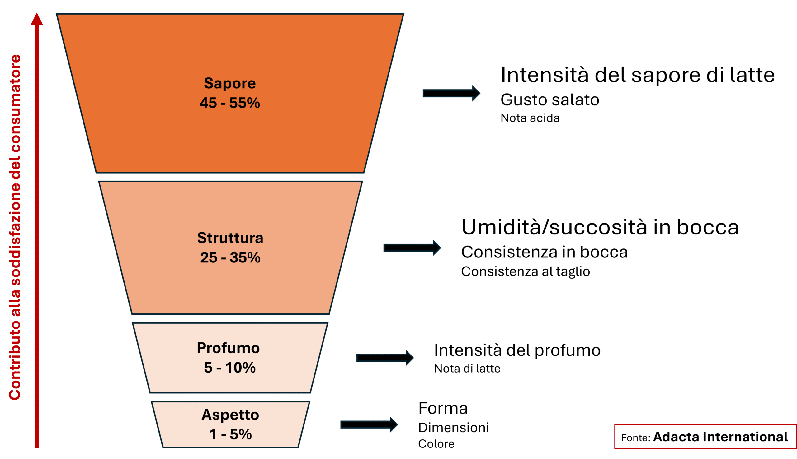 Subito dopo il sapore, c’è la struttura della mozzarella ad incidere per il 25-35% sul giudizio di soddisfazione complessiva. Qui entrano in gioco aspetti come la succosità e la consistenza in bocca.